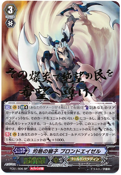 [ACT](VC) Limit Break 4 (Esta habilidad se activa si tienes cuatro o más daños): [Counter Blast (2)] Mira la carta de la cima de tu deck, puedes buscar hasta un <<Gold Paladin>> entre ella, llamalo a (RC), y coloca el resto en el fondo de tu deck, e incrementa el [Poder] de esta unidad con el [Poder] original de la unidad llamada por este efecto hasta el final del turno.