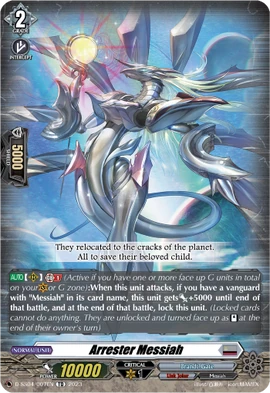 | [AUTO](RC) Generation Break 1 (Active if you have one or more face up G units in total on your (VC) or G zone):When this unit attacks, if you have a vanguard with "Messiah" in its card name, this unit gets [Power]+5000 until end of that battle, and at the end of that battle, lock this unit. (Locked cards cannot do anything. They are unlocked and turned face up as [Stand] at the end of their owner's turn) |