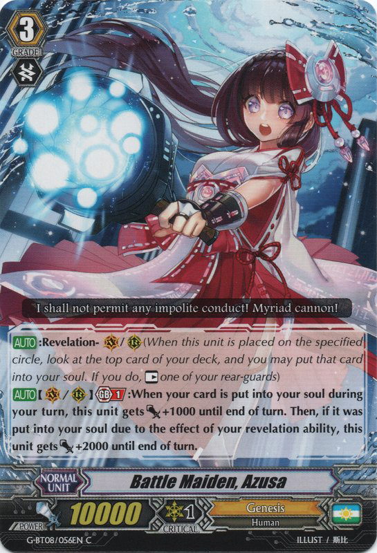 | [AUTO]:Revelation-(VC/RC) (When this unit is placed on the specified circle, look at the top card of your deck, and you may put that card into your soul. If you do, [Rest] one of your rear-guards) [AUTO](VC/RC) Generation Break 1 :When your card is put into your soul during your turn, this unit gets [Power]+1000 until end of turn. Then, if it was put into your soul due to the effect of your revelation ability, this unit gets [Power]+2000 until end of turn. |