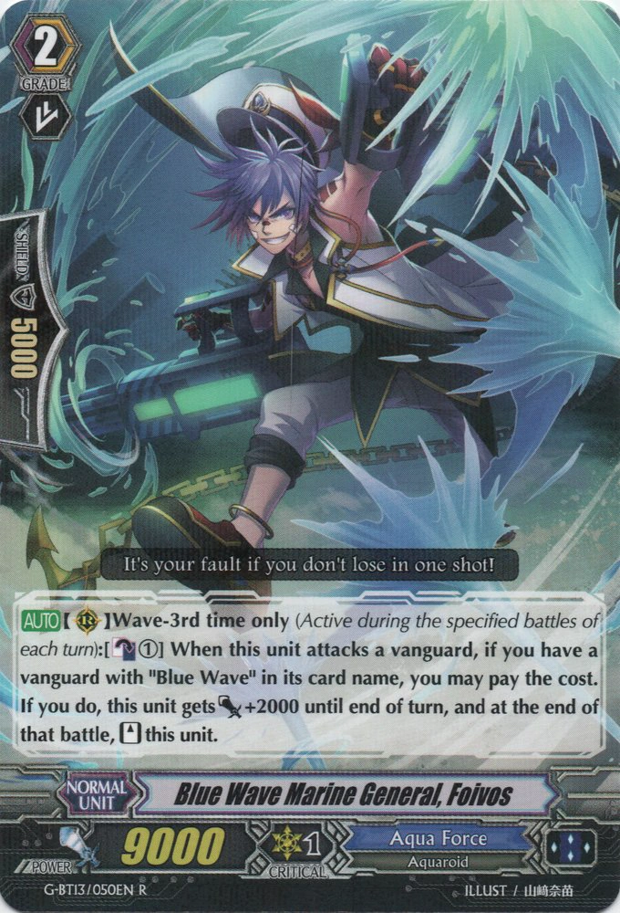 | [AUTO](RC) Wave-3rd time only (Active during the specified battles of each turn):[Counter Blast (1)] When this unit attacks a vanguard, if you have a vanguard with "Blue Wave" in its card name, you may pay the cost. If you do, this unit gets [Power]+2000 until end of turn, and at the end of that battle, [Stand] this unit. |