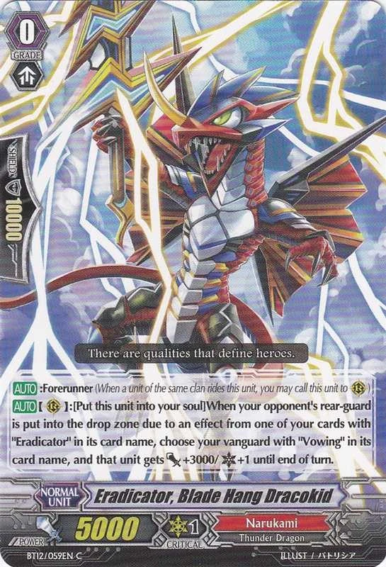 | [AUTO](RC):[Put this unit into your soul] When your opponent's rear-guard is put into the drop zone due to an effect from one of your cards with "Eradicator" in its card name, choose your vanguard with "Vowing" in its card name, and that unit gets [Power]+3000/[Critical]+1 until end of turn. |