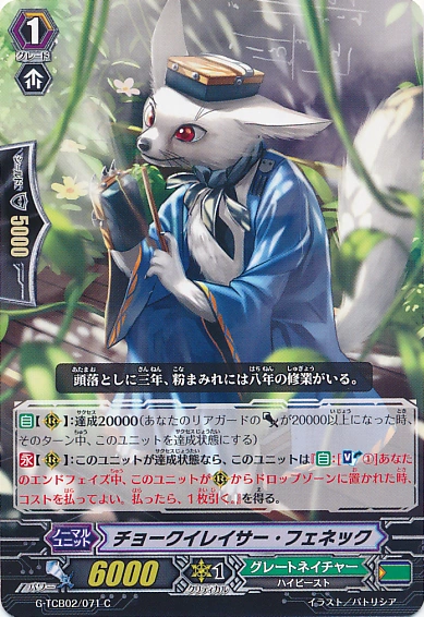 | [AUTO](RC):Success 20000 (When your rear-guard's [Power] becomes 20000 or greater, this unit becomes successful until end of turn) [CONT](RC):If this unit is successful, this unit gets "[AUTO]:[Soul Blast (1)] During your end phase, when this unit is put into the drop zone from (RC), you may pay the cost. If you do, draw a card.". |