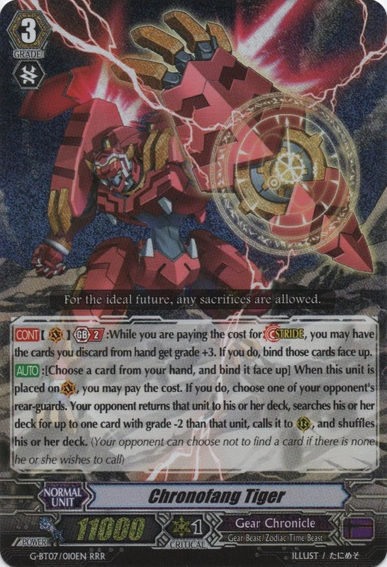 "Chronofang" (クロノファング Kuronofangu) is a series of cards with "Chronofang" in its card name exclusive to the Gear Chronicle clan. The first card was introduced in G Booster Set 7: Glorious Bravery of Radiant Sword, and received its first support in G Clan Booster 4: Gear of Fate.