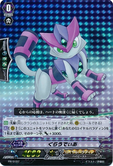 | [AUTO]:Forerunner (When a unit of the same clan rides this unit, you may call this unit to (RC)) [ACT](RC):[Put this unit into your soul] Choose up to one of your «Royal Paladin», and that unit gets [Power]+3000 until end of turn. |