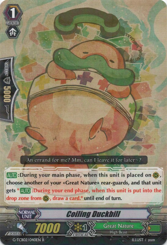 | [AUTO]:During your main phase, when this unit is placed on (RC), choose another of your «Great Nature» rear-guards, and that unit gets "[AUTO]:During your end phase, when this unit is put into the drop zone from (RC), draw a card." until end of turn. |