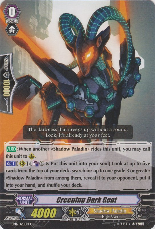 | [AUTO]:When another «Shadow Paladin» rides this unit, you may call this card to (RC). [ACT](RC):[Counter Blast (1) & Put this unit into your soul] Look at up to five cards from the top of your deck, search for up to one grade 3 or greater «Shadow Paladin» from among them, reveal it to your opponent, put it into your hand, and shuffle your deck. |