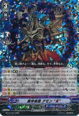 | [ACT](VC) Limit Break 4 (This ability is active if you have four or more damage):[Choose one of your «Dark Irregulars» rear-guards, and lock it] This unit gets [Power]+1000 for each «Dark Irregulars» in your soul until end of turn. If the number of «Dark Irregulars» in your soul is six or more, this unit gets [Critical]+1 until end of turn. This ability cannot be used for the rest of that turn. (The locked card is turned face down, and cannot do anything. It turns face up at the end of the owner's turn) [CONT](VC): If you have a card named "Demon World Marquis, Amon" in your soul, this unit gets [Power]+2000. [CONT](VC/RC):Lord (If you have a unit without a same clan as this unit, this unit cannot attack) |