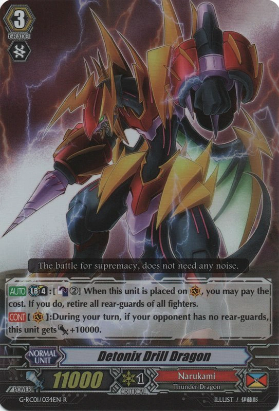 at the end of battle and discards cards based on the number of opponent rear-guards still present on the field. To ease these requirements, Detonix Stinger Dragon is able to bind an opponent's front row rear-guards when it rides or is called to field and when ridden over, confers [Power]