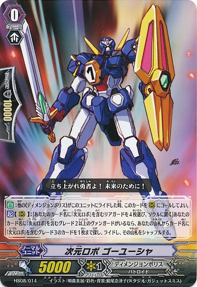 | [AUTO]: When another «Dimension Police» rides this unit, you may call this card to (RC). [ACT](RC):[Choose four of your rear-guards with "Dimensional Robo" in its card names, and put them into your soul] If you have a grade 2 or greater «Dimension Police» vanguard with "Dimensional Robo" in its card name, search your deck for up to one grade 3 card with "Dimensional Robo" in its card name, ride it, and shuffle your deck. |