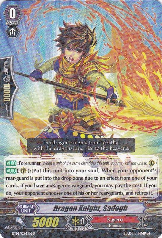 | [AUTO]:Forerunner (When a unit of the same clan rides this unit, you may call this unit to (RC)) [AUTO](RC):[Put this unit into your soul] When your opponent's rear-guard is put into the drop zone due to an effect from one of your cards, if you have a «Kagero» vanguard, you may pay the cost. If you do, your opponent chooses one of his or her rear-guards, and retires it. |