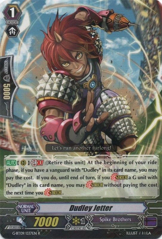 | [AUTO](RC) Generation Break 1 :[Retire this unit] At the beginning of your ride phase, if you have a vanguard with "Dudley" in its card name, you may pay the cost. If you do, until end of turn, if the G unit you Stride has "Dudley" in its card name, you may Stride without paying the cost of the next Stride. |