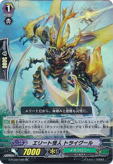 | [AUTO](RC):At the beginning of your opponent's ride phase, if your opponent has a unit that is [Rest], look at the five cards from the top of your deck, search for up to one card with "Giraffa" in its card name from among them, reveal it to your opponent, put it into your hand, and shuffle your deck. |