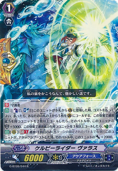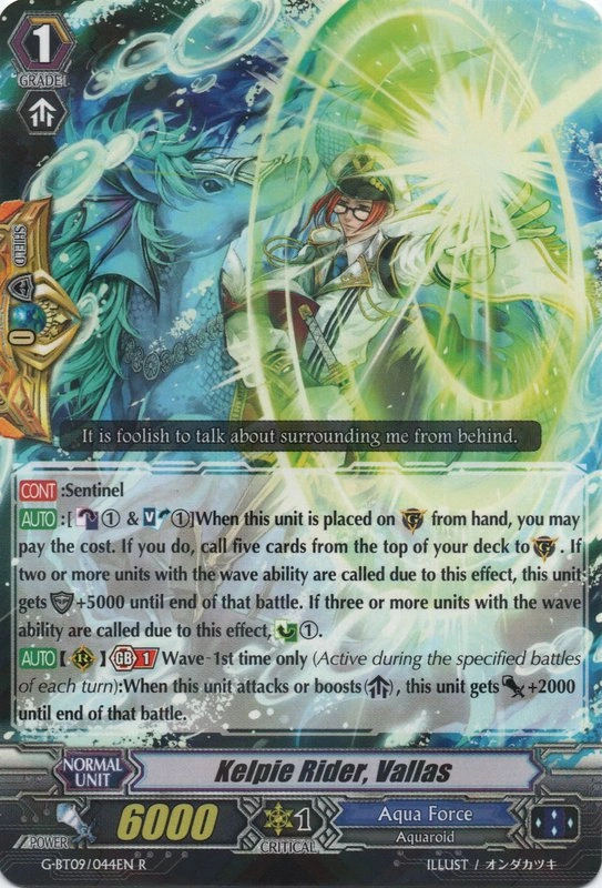 | [CONT]:Sentinel [AUTO]:[Counter Blast (1) & Soul Blast (1)] When this unit is placed on (GC) from hand, you may pay the cost. If you do, call five cards from the top of your deck to (GC). If two or more units with the wave ability are called due to this effect, this unit gets [Shield]+5000 until end of that battle. If three or more units with the wave ability are called due to this effect, Counter Charge (1). [AUTO](RC) Generation Break 1 Wave-1st time only (Active during the specified battles of each turn):When this unit attacks or boosts, this unit gets [Power]+2000 until end of that battle. |