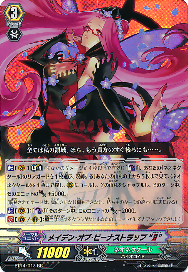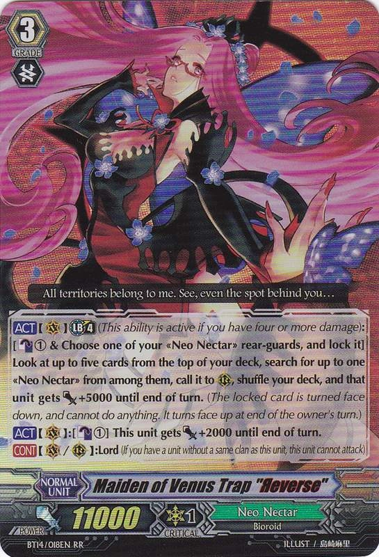| [ACT](VC) Limit Break 4 (This ability is active if you have four or more damage):[Counter Blast (1) & Choose one of your «Neo Nectar» rear-guards, and lock it] Look at up to five cards from the top of your deck, search for up to one «Neo Nectar» from among them, call it to (RC), shuffle your deck, and that unit gets [Power]+5000 until end of turn. (The locked card is turned face down, and cannot do anything. It turns face up at the end of the owner's turn) [ACT](VC):[Counter Blast (1)] This unit gets [Power]+2000 until end of turn. [CONT](VC/RC):Lord (If you have a unit without a same clan as this unit, this unit cannot attack) |