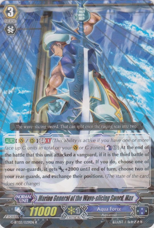 | [AUTO](VC/RC) Generation Break 1 (Active if you have one or more face up G units in total on your (VC) or G zone):[Counter Blast (1)] At the end of the battle that this unit attacked a vanguard, if it is the third battle of that turn or more, you pay the cost. If you do, choose one of your rear-guards, it gets [Power]+2000 until end of turn, choose two of your rear-guards, and exchange their positions. (The state of the card does not change.) |