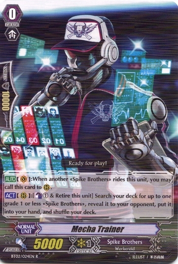 | [AUTO]:When another «Spike Brothers» rides this unit, you may call this card to a (RC). [ACT](RC):[Counter Blast (1) & Retire this unit] Search your deck for up to one grade 1 or less «Spike Brothers», reveal it to your opponent, put it into your hand, and shuffle your deck. |