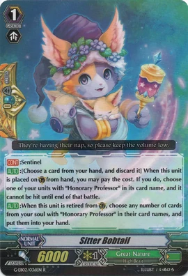 | [CONT]:Sentinel [AUTO]:[Choose a card from your hand, and discard it] When this unit is placed on (GC) from hand, you may pay the cost. If you do, choose one of your units with "Honorary Professor" in its card name, and it cannot be hit until end of that battle. [AUTO]:When this unit is retired from (GC), choose any number of cards from your soul with "Honorary Professor" in their card names, and put them into your hand. |