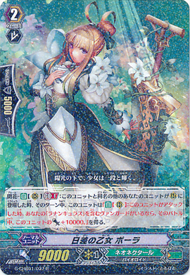 | Bloom-[AUTO](RC) Generation Break 1 :When your other unit with the same card name as this unit is placed on (RC), until end of turn, this unit gets "[AUTO](RC):When this unit attacks, if you have a vanguard with "Ranunculus" in its card name, this unit gets [Power]+10000 until end of that battle.". |