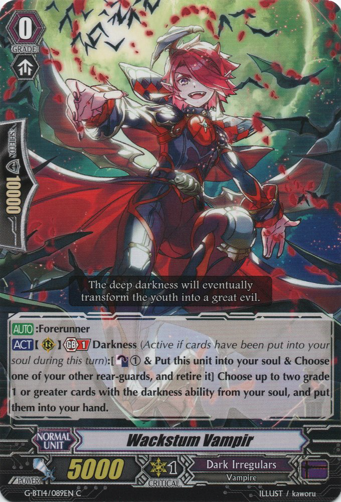 | [AUTO]:Forerunner [ACT](RC) Generation Break 1 Darkness (This ability is active if cards have been put into your soul during this turn):[Counter Blast (1) & Put this unit into your soul & Choose one of your other rear-guards, and retire it] Choose up to two grade 1 or greater cards with the darkness ability from your soul, and put them into your hand. |